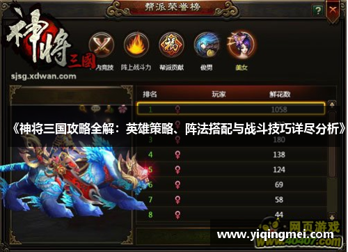 《神将三国攻略全解:英雄策略、阵法搭配与战斗技巧详尽分析》为玩家提供了全面的游戏攻略,帮助玩家在游戏中掌握核心战斗技巧。通过合理选择和培养英雄,精心搭配阵法,运用战斗技巧,玩家能够在不同的战斗模式中取得优势,提升自己的游戏水平。